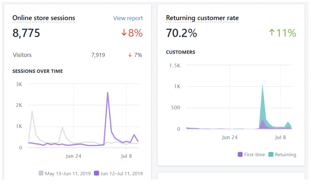 My returning customer rate is really high. In the past 30 days, it’s at 70.2% and I’ve gotten 8,775 traffic sessions (this is sessions, not pageviews).